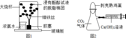魔术一凡破“奇花变色:酚酞遇碱性物质会变成红色,而浓氨水呈碱性,所以可观察到“铁树”上浸有无色酚酞试液的棉团由白色变为红色;“铁树”和浓氨水并没有接触,考虑到分子的性质和浓氨水的性菜侨质可以知道产生该现象的原因为:A、分子是不断运动的行乡愚;C、浓氨水具有挥发性;D、氨气的水溶液显碱性;而选项B没有涉及到,故填B;魔术二“瓶吞鸡蛋”:二氧化碳可以与氢氧化钙溶液反应,生成沉淀和水,从而使瓶内气压降低,小于大气压,大气压把鸡蛋压入;所以将注射器中氢氧化钙溶液注入瓶中,片刻后会看到鸡蛋被“吞”入瓶中,所发生的反应为二氧化碳和氢氧化钙的反应.故答案为:魔术一:红;B;魔术二:CO2+Ca(OH)2→CaCO3↓+H2O