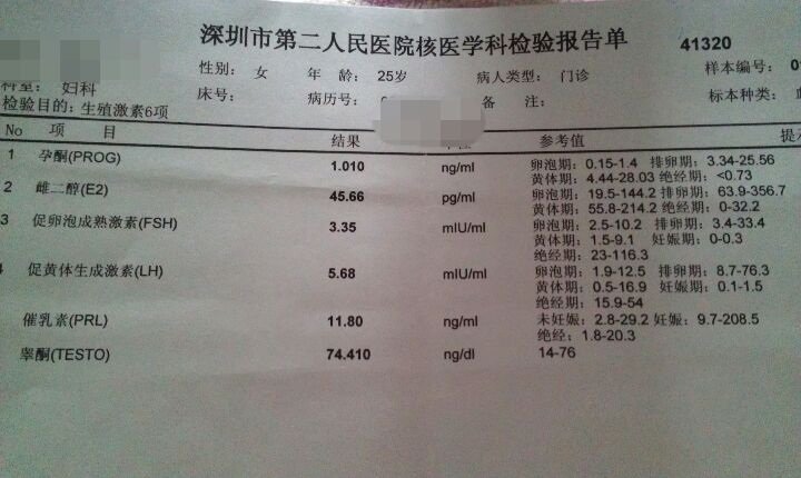 请问医生帮忙看看这个性激素6项正常吗?是来月经第五天抽血检查的,要看哪个期呢?!因为上面的提示全部 空白所以不懂!还有经期周期长40-50天!检查过一次说多囊,第二次检查又说没有了!现在想怀孕有其他办法吗?可以打排卵针吗?如何打排卵针? 点击展开 匿名用户 2014-04-15 18:20 为您推荐: 其他回答 病情分析: 您好,你的情况,考虑是卵泡期的情况,结果基本符合生理期的情况 指导意见: 您好,你的情况,应该没事的,建议注意观察卵泡发育情况。 匿名用户 2014-04-15 18:34 相关问题 帮忙看看“性激素六项”结果 月经来的第二天抽血检查的结果 医生的回复第3,第4 有点偏低,是否影响怀孕 身高163 体重84公斤 性激素检查中睾酮高 一直在吃达英35 这个月月经推迟12天又来了 上个月月经7号来,这月没来两天小腹疼去医院检查抽血等,医生说是怀孕,给开了保胎药,吃了两天药今天上