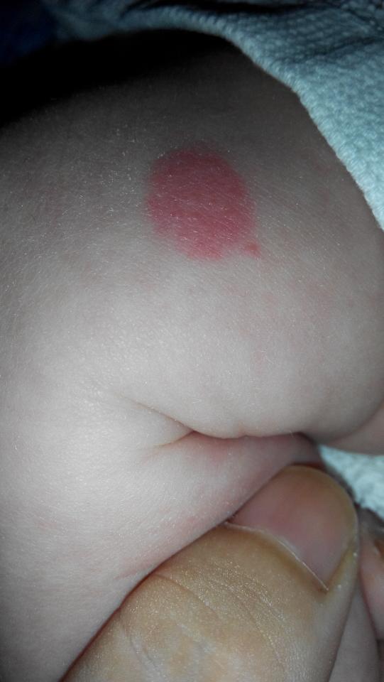 宝宝大腿上有一块红点,有见过类似情况的帮忙看一下是什么?之前是没有,前天洗澡时发现的,我擦了酒精消