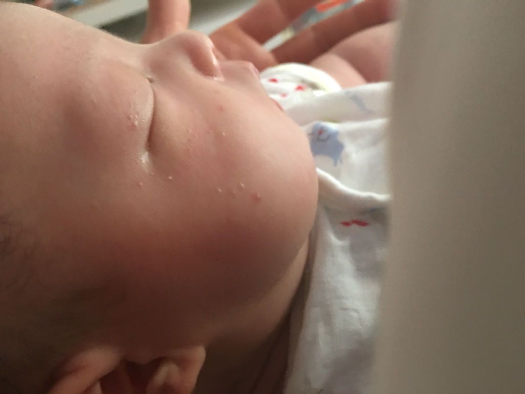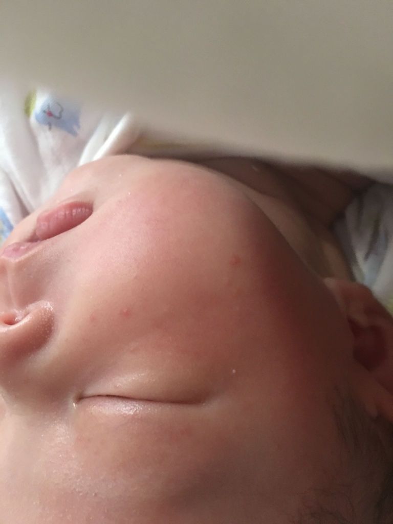 您好,考虑是婴儿湿疹,也叫“胎毒立呈”,“奶癣”,是婴儿时期常见的一种皮肤病,属于变态反应性疾病,也叫过敏性疾病,以1~3个月大的婴儿最为多叨做见.导致婴儿湿疹发生的原因比较复杂:外界对婴儿皮肤的刺激,婴儿消化不良以及先天性的过敏体质都可能诱发此病. 可以给患儿口服0.2%的苯海拉明糖浆,给药的剂量应按每天每公斤体重1~2毫克计算,每愚航患天分3~4次服用.