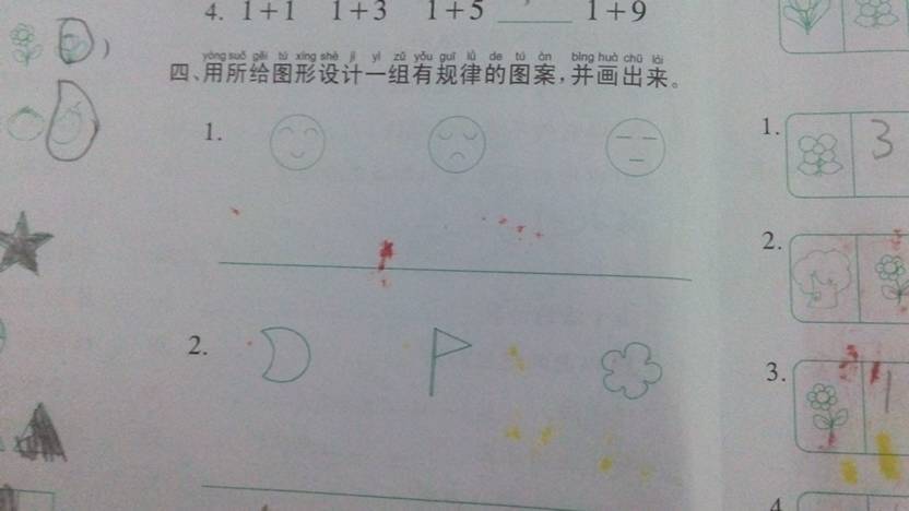 求解幼儿园数学题按规律设计图案 点击展开 匿名用户 2014-10-07 17:55 为您推荐: 其他回答 好深奥 匿名用户 2014-10-07 17:57 相关问题 幼儿园班牌设计图案怎样最创新啊 小孩7岁做数学题的时候不理解规律怎么办 请教一下 小孩一年级有道数学题是按规律填数 17,( ),11,( )不知有谁能帮助一下?谢谢
