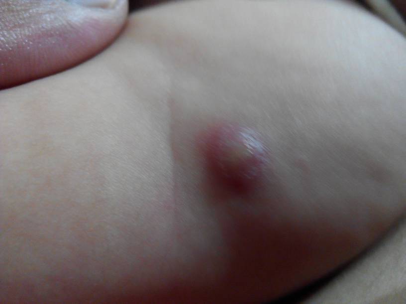 是不是表面有点黄,要是的话,是因为宝宝皮肤好,脓包没发出来,就张住了,用热水里加硫酸镁敷敷三天就好了,脓包必须出干净了,我宝宝就是,现在好了