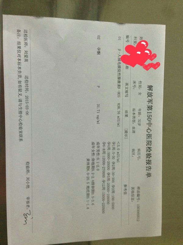 百度 问:我1月29号末次月经,3月6号抽血化验hcg和孕酮,可以帮忙看看如果怀孕数值正 常否吗? 平常周期都是30到35天左右,主要两个月前做过流产手术,因为当时孕酮才18,大意了,后来快三个月时出血了,孕酮才12就做手术了,所以这次格外小心,我上次做流产手术是11月29号,这次怀孕间隔这么近,对孩子有没有大的影响啊,麻烦您了 点击展开 菲童梵翔糖豆 2015-03-08 07:55 为您推荐: 其他回答 目前看数值还可以,因为有过胚胎发育不良病史,所以以后情况不太好说。定期复查吧。 cn#BaupBQfQfk 2015-03-08 10:25 相关问题 12 27验血HCG是4248,12月31去验的时候只有2726 孕酮只有5 53ng/ml!想请教下百度网友,这个数值正常吗? 我怀孕6周,抽血化验结果如下:HCG 62828 mIU/ml ; 雌二醇(E2) 905 4 pg/ml 孕酮 29 99 ng/ml 孕早期出血较多止血后孕酮和HCG升高,现在还有少量褐色液体流出,明天又该抽血化验了,孕激素还会再