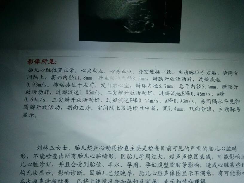 指导意见:你好,B超提示有心脏疾病,房间隔缺损,室间隔缺损。建议复查。及时咨询产科医生。