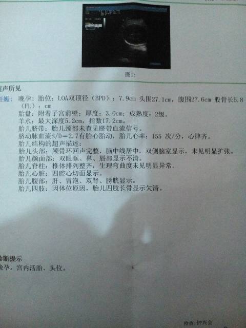你好:根据彩超结果来看大致是孕31周左右。 估计胎儿体重约为3.71 斤。胎儿体重的计算只是一个估计值,没有那么的准确。一般来说,胎儿的的实际体重与估计的体重会有正负大约10-15%的误差。正常足月儿在临产时的体重正常值应为2500g至4000g。