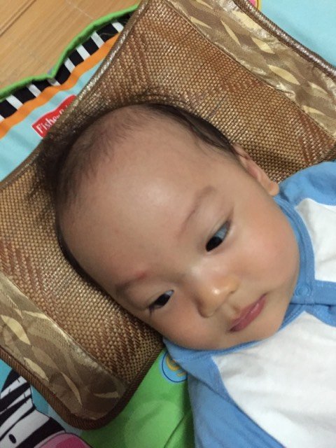 四个月宝宝,抱着的时候头撞到我牙齿,眉毛那顿时起了红色的包,怎么办?要去医院吗?小孩哭了几声就停了