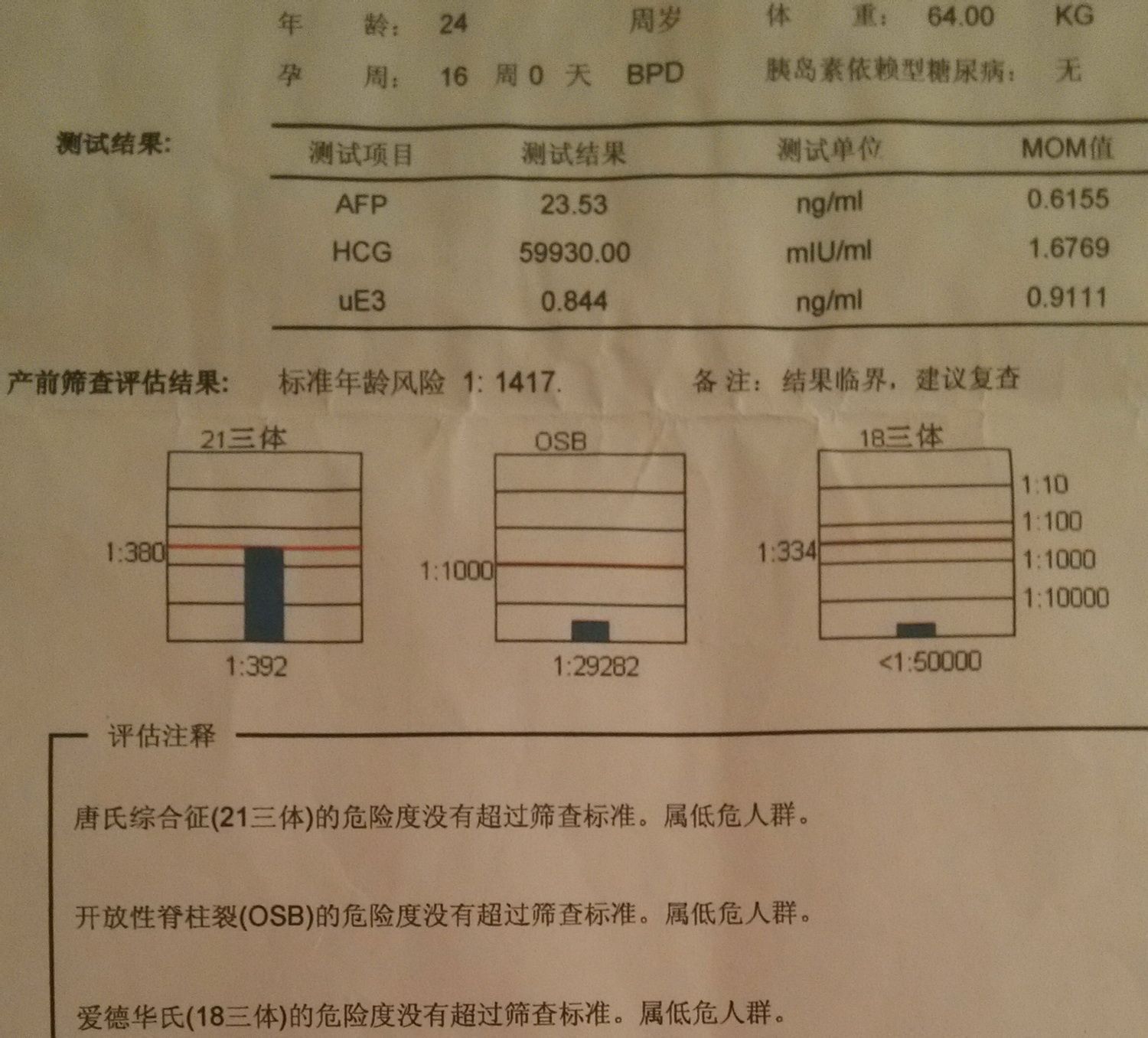 结果出来了,可是其他一切都正常,唯有21三体综合征1:392,可是底的评估注释又显示:唐氏综合征的危险度没有超过筛查标准,属低危人群。咨询了医生,医生说这个不用太紧张,等做四维彩超的时候在仔细观察一下,可是我心里还是有些担心,好害怕,朋友们该怎么办?