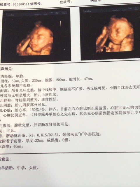 今天刚照的四维,希望宝宝健健康康 点击展开 天堂无约 2014-11-04 16:02 为您推荐: 其他回答 您好!从这个检查结果来看,您的宝宝一切正常,结果都是很好的。祝您好孕。 cn#BBpLfaVBau 2014-11-04 21:18 相关问题 怀孕一个月时不知道,拉肚子打了左氧氟沙星,现在20周了,要做四维好担心呀!希望宝宝健健康康! 还有两天四维了,希望宝宝健健康康! 还有20天要去做四维了希望宝宝健健康康的👼👼