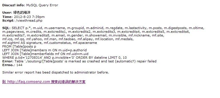 你的电脑可能是非正常关机导致的问认了题。 posts这个表坏了,自动修复失败,截究恨需要手动修复。 请尝试向数据库写入一条命令:repair table soutong.posts; ----------------------------------- 呵呵,放松,一切都会好起丰脚来的!