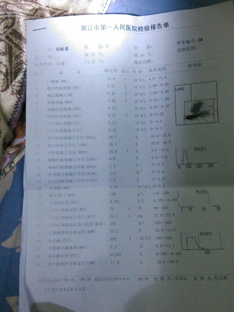 宝宝17个月 查血常规如下 请问严重吗?白细胞的值17.8 点击展开 匿名用户 2014-06-07 03:34 为您推荐: 其他回答 宝宝生病中? 匿名用户 2014-06-07 07:26 需要到医院看看,找专家门诊 匿名用户 2014-06-07 05:52 有合并感染的可能! 爱兴修_fulC 2014-06-07 03:58 相关问题 怀孕21周查血常规 白细胞值为20,太高了,怎么办啊?用药会不会对宝宝有影响啊? 宝宝大脑缺氧,查血,镁,最低值,怎么办???以后会不会变傻啊?? 宝宝四个多月 今天发烧到38,2度 白细胞21点几 医生让挂了盐水 但别人都是这么小挂盐水不