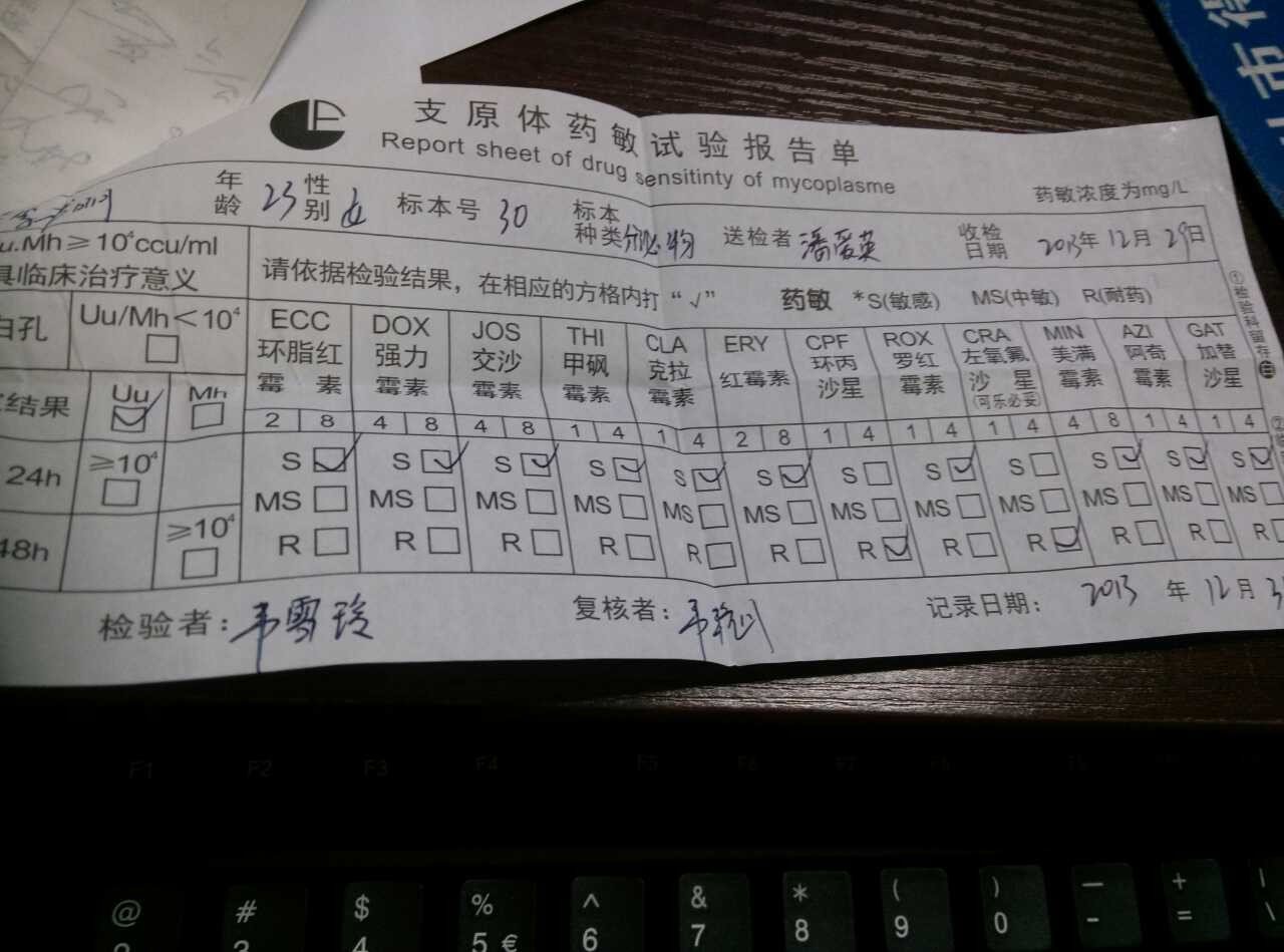 问:检查出来支原体阳性,这个是药敏实验报告单,严重吗?吃什么药效果好?如果转阴了,可以马上要小孩吗 点击展开 ming醉清风 2014-05-04 16:14 为您推荐: 其他回答 药敏是除了喹诺桐类药物耐药外,其它药物均敏感啊。 沃秋玉_BWUs 2014-05-04 21:48 问看病的医生啊 匿名用户 2014-05-04 16:52 相关问题 支原体阳性,吃了药转阴多长时间能怀孕?? 怀孕后查处支原体感染!是否能要小孩 感染了解脲支原体多久才能要小孩