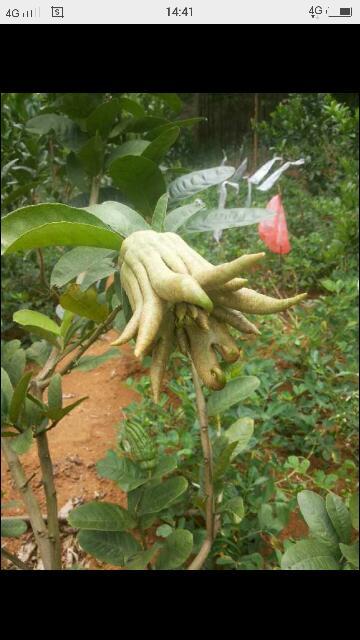 佛手神且涌(学名:Citrus medica L. var. sarcodactylis Swingle):果实在成熟时各心皮分离,形成细长弯曲的果瓣,状如手指,故名佛手。 常绿灌木或小乔木,高达丈余,茎叶基有长约6厘米的硬锐刺,新枝三棱形。单叶互生,长椭圆形,有透明油点扬泳。花多在叶腋间生出,常数朵成束,其中雄花较多,部分为两性花,花冠五瓣,白色微带紫晕,春局了分至清明第一次开花,常多雄花,结的果较小,另一次在立夏前后,9-10月成熟,果大供药用,皮鲜黄色,皱而有光泽,顶端分歧,常张开如手指状,故名佛手,肉白,无种子。 通常用作中药,或因其果形奇特,而作为观赏植物。佛手柑被大量制作成凉果食用及出售。。