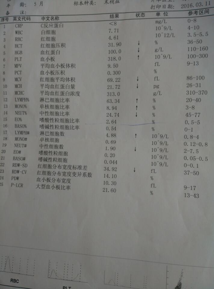 在线等,请医生帮我看看五个半月宝宝的验血报告单,宝宝咳嗽后音有点喘的感觉,呼吸有点呼哧呼哧的,大夫 在线等,请医生帮我看看五个半月宝宝的验血报告单,宝宝咳嗽后音有点喘的感觉,呼吸有点呼哧呼哧的,大夫给开了药,没有说是什么病,我宝宝病的重吗?非常感谢! 点击展开 189*****532_5NSB 2016-03-11 13:46 为您推荐: 其他回答 不知道。。 熊_hrih 2016-03-12 10:32 七个月,, 阳阳妈咪• 2016-03-11 21:15 感冒了吧。 随釦説钚鍀 2016-03-11 16:47 不知道!! 😊爱宝贝@ 2016-03-11 15:14 你问问医生, 小昊然妈 2016-03-11 14:40 加载更多 相关问题 小孩刚满月 开始时有点咳嗽去医院看医生开的药也吃了 但现在呼吸嗓子有痰音怎么办 小孩咳嗽不止,感觉胸部呼吸时也有声音,去医院医生说也没事,怎么可以让他止咳快些,吃些什么好? 宝宝咳嗽好几天了,今天去检查验血说有炎症,医生开了个咳喘灵,利巴韦林和安儿宁颗粒,请问吃这些有用吗