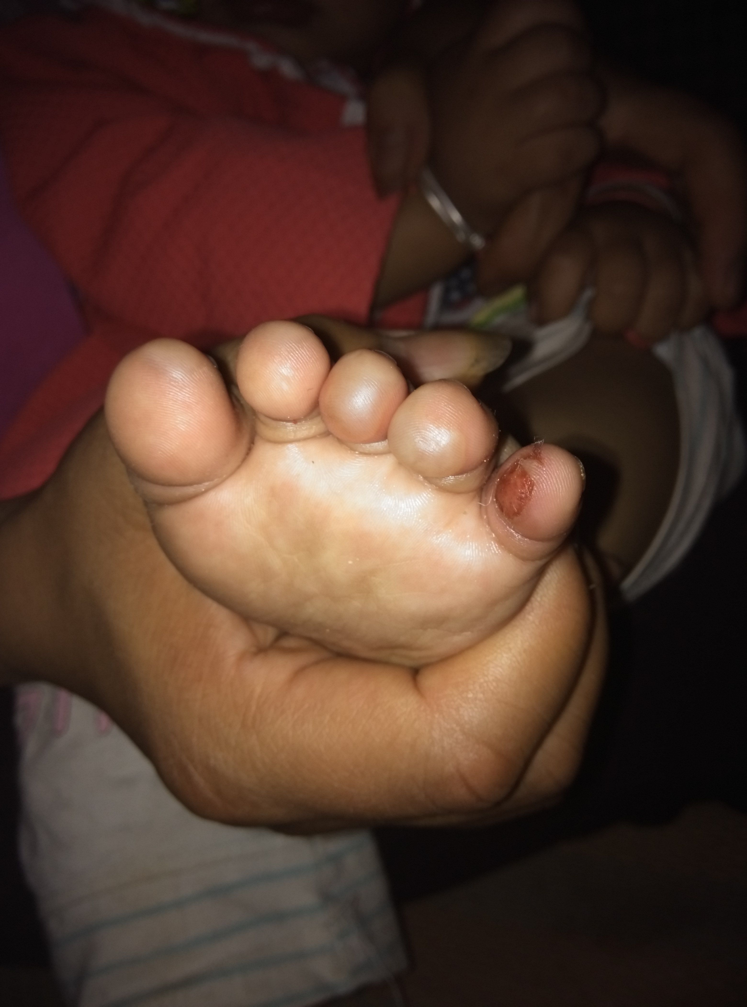 我家宝宝左脚每个脚指头上都长了一个水泡,小指上的破皮了,露出红红的肉,今天去医院医生都说不出是怎么 了,跪求帮帮忙,谢谢您了 点击展开 匿名用户 2014-07-22 21:51 为您推荐: 其他回答 你好,我感觉宝宝的水泡是比较严重的哦,宝妈最好让大夫检查一下,可以明确的为宝宝治疗 斑驳的流年88 2014-07-23 10:09 相关问题 我家小孩1岁半,脚指头老是一直退皮,红红的,就大拇指跟食指,怎么回事,是脚气吗? 宝宝两个半月了,屁股肛门两边红红的一团看起来一开始是红色颗粒后就成一团了请问医生怎么回事! 我想问下医生,我宝宝额头上红红的是不是奶藓?脸颊两边也有,是的话有什么方法可以治疗,现在可能有点痒