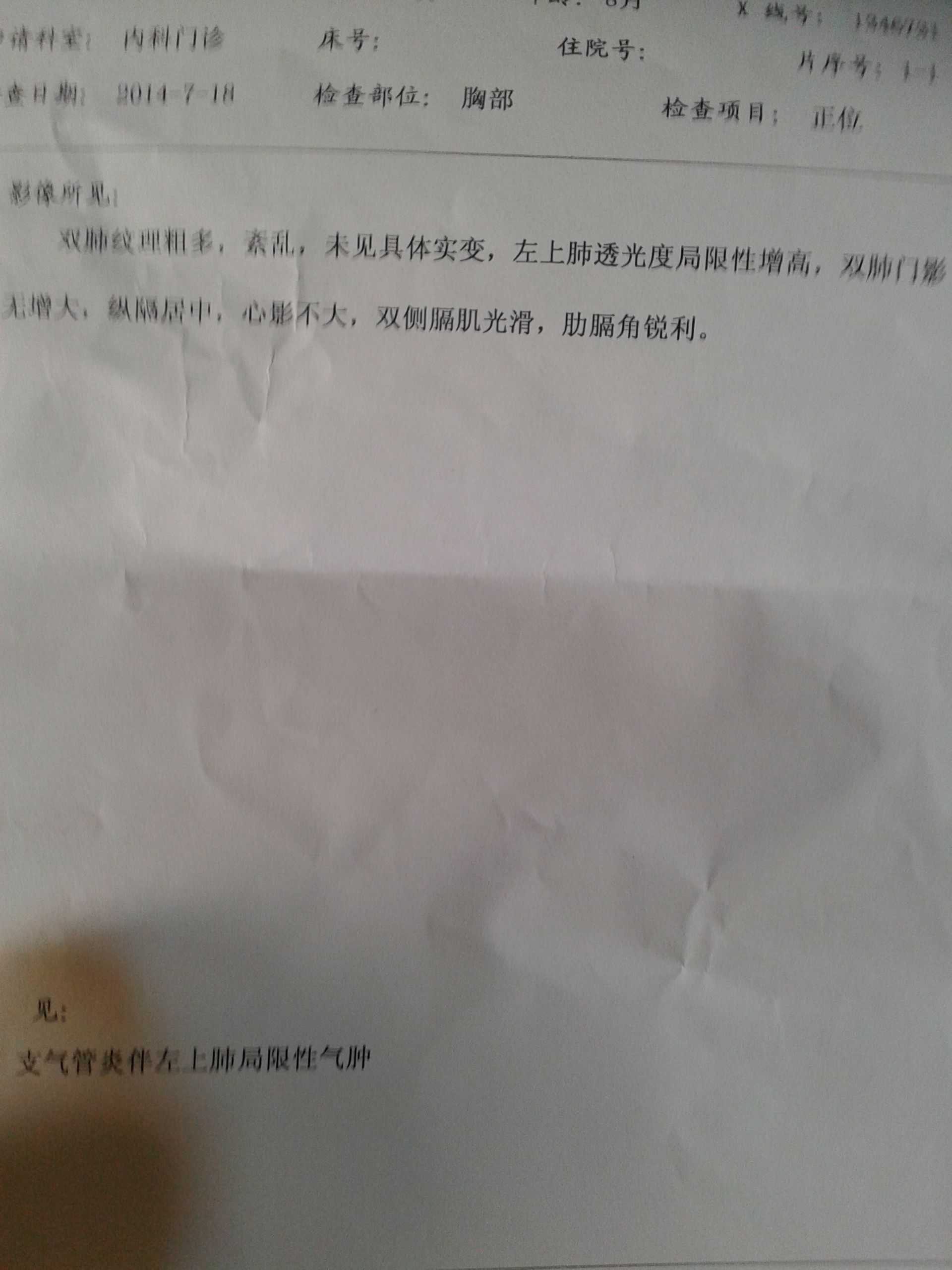 我家小孩8个月了,最近老实咳嗽,呼吸感觉有痰,有点喘(不发烧) 去儿童医院检查了 医生说让住两天院 ,我拒绝了,医生说那就吃药康复吧。请大家帮忙看看这个片子,我家孩子是怎么了,需要怎么治疗,是否需要住院或输液? 点击展开 母婴用户207659320 2014-07-18 10:05 为您推荐: 其他回答 你好,一般这个时候出现这样的情况最好能够及时的给宝宝住院治疗的,,否则的话很容易转变成肺炎 adfaffq 2014-07-20 08:58 相关问题 宝宝咳嗽有痰,呼吸有点声音医生说是肺炎打了两天针还没好转有没有什么办法让宝宝快点好 宝宝两个月了 去医院查血是上呼吸道感染,她咳嗽有痰 医生给开的肺力咳合剂和头炮羟氨苄颗粒 我又给买 小孩发烧好的差不多了,胆是有点咳嗽,医生就开了硫酸特步他林片,我上午喂了一次,晚上给小孩洗澡的时候