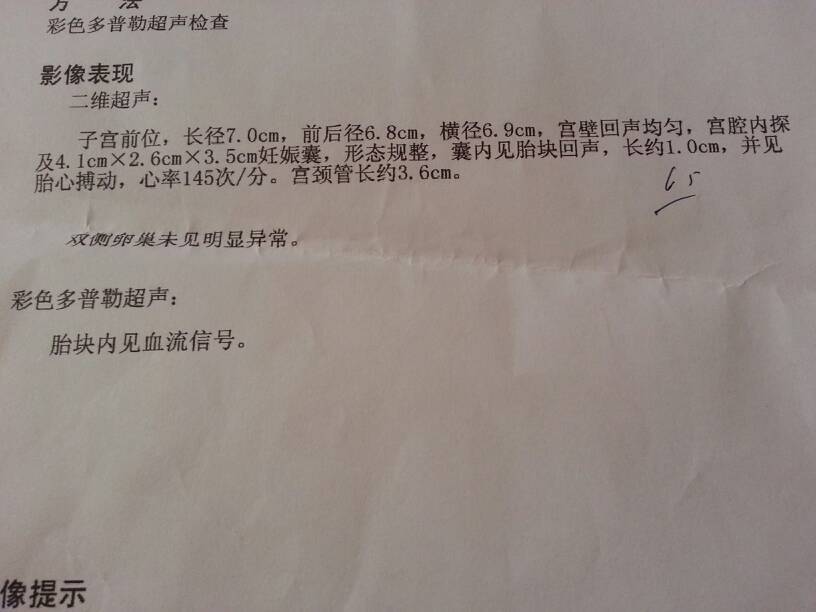 从超生描述来看,可以看见胎心搏动,说明是活胎。胎儿是健康的,大约时间是7周的样子