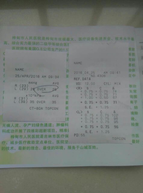 上午带孩子去测视力但是检测表看不懂,医生说让去别的医院在检查一下,有会看的吗帮忙看看谢谢 点击展开 匿名用户 2016-04-25 13:06 满意回答 您好,悼近坐左边单子是眼压检查导寸结果。验光的意思是,右眼75度以峡远视,75度远视散光,散光轴是71度。左眼是75度远视,75度远视散光,轴是96度。 cn#aVfuaVVuVf 2016-04-25 13:11 宝宝知道提示您:回答为网友贡献,仅供参考。 相关问题 孩子3岁,幼儿园体检说视力有问题,但表上数据看不懂:R 3 S+4 25 C-1 75 A110 L 5 S+5 00 C-2 75 A86 孩子视力表帮忙看看,看不懂,需要怎么修复? 我家宝宝4个月了,在儿童医院做视力筛查,医生说有散光,孩子这么小怎么有散光呢!怎么办呢?