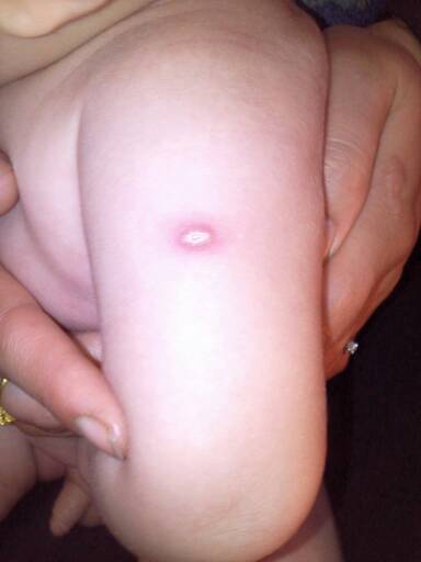 我儿子快3个月了,今天发现左手种豆处化脓包了,有点红肿 请问是咋回事?咋处理?