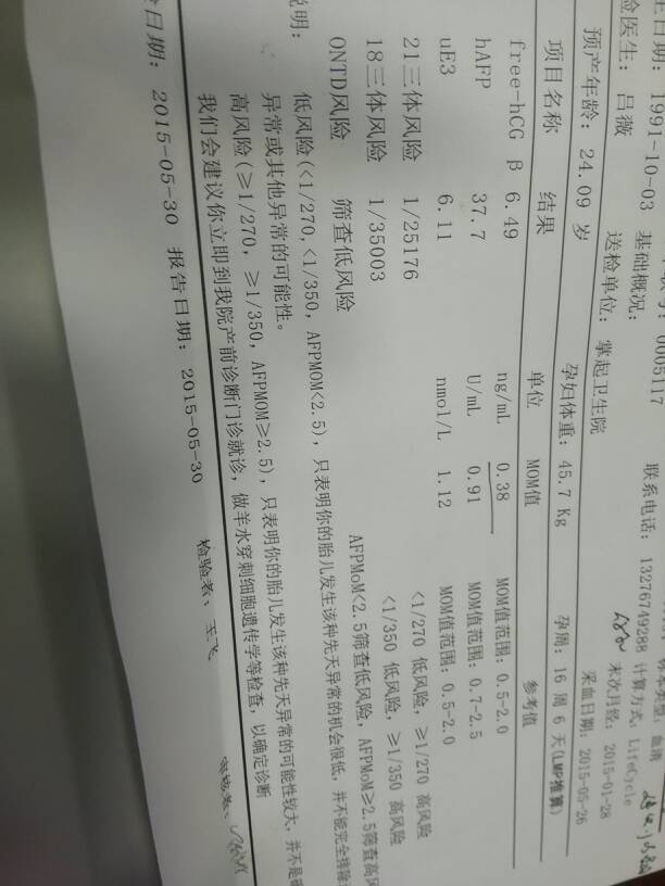 谁能看懂唐筛结果吗?能帮我看看我的结果怎么样? 谁能看懂唐筛结果吗?能帮我看看我的结果怎么样? 点击展开 潘 2015-06-10 18:31 为您推荐: 其他回答 你又不明白都可以问他 幸福的一家子@ 2015-06-10 23:50 是低风险哺 佑辰的妈妈 2015-06-10 22:57 祝宝妈好孕!!!!! 〆ηǐ丶越走越淡づ 2015-06-10 20:21 没事,不是有低风险吗, 💋挚爱** 2015-06-10 19:26 祝宝妈好孕 琪琪儿时 2015-06-10 19:07 加载更多 相关问题 请高手帮我看看唐筛结果!谢谢! 跪求专家帮我看看此唐筛检查结果怎样 末次月经推算孕周16+2实际应该在18周左右当时填错了! 请大家帮我看看唐筛结果中的甲胎蛋白和人绒毛膜促性激素是否正常?谢谢谢谢!谢谢大家了!
