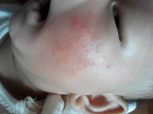 上面的药膏看不清是什么成分。最好还是用宝宝湿疹霜吧,中成药的,没有什么副作用。
