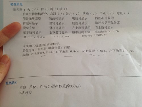 bpd:9.4cm fl:7.4cm 胎心:133 胎盘:IIIA级 羊水指数:右上象限8