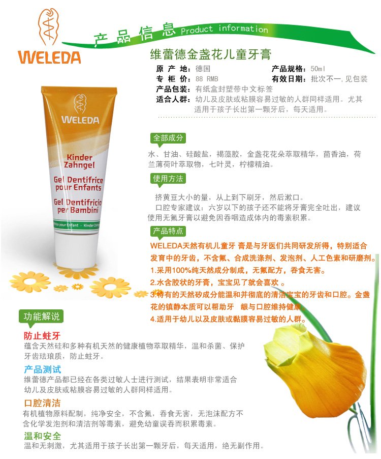 帮我想几个词形容这款产品儿童牙膏进口可食用无氟牙膏婴儿宝宝牙膏可吞咽德国Weleda维蕾德 要吸引力好点的词语 点击展开 匿名用户 2020-08-19 18:40 满意回答 不错 匿名用户 2020-11-02 04:48 宝宝知道提示您:回答为网友贡献,仅供参考。 相关问题 2岁宝宝刷牙需要用牙膏么 可吞咽的牙膏对宝宝有危害么 给宝宝刷牙,他特别喜欢吃牙膏,每次才一放到嘴里就吞下去了,虽然买的是可吞咽牙膏,吃多了是不是不好? 孩子一岁半了,不知道怎么才是给孩子正确的刷牙方式,有宝妈知道吗?我现在是买了牙刷和可以吞咽的牙膏,给孩子刷牙后,用纱布直接把多余的牙膏擦掉,没有用水漱口,请问下