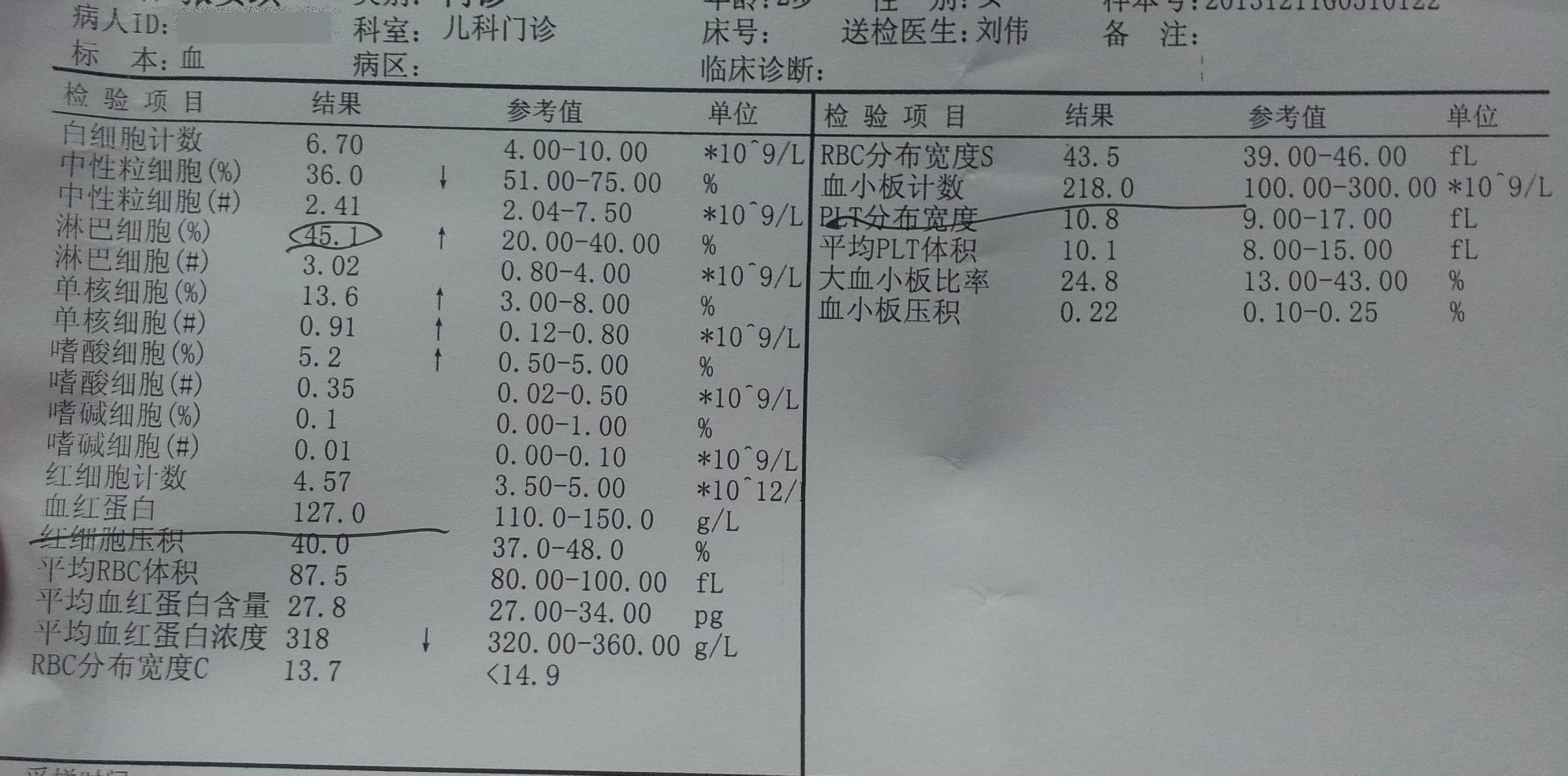 3岁孩子,幼儿园回来后晚上开始发烧,吃了氨酚黄那敏颗粒,睡后两小时左右发汗,退烧,早起时量体温37 .5度,白天就没去幼儿园,在家休息,没有发觉发烧,到了晚上睡觉时候又发烧,量体温38度,还是吃的感冒药加蓝芩口服液,一小时左右又退烧了,第三天起床体温正常,无其他症状,但老人还是带去医院去检查,说是病毒感染,扁桃体化脓,开了两针头孢,跟口服的药(名字没记住,看了下是治疗疱疹的),现在两针打完了,没有去复查。想问一下:1、现在目测症状什么的都没有,就是继续在喝氨酚黄那敏颗粒跟那个治疱疹的药,还需要服用什么抗病毒的药吗?2、孩子班上的小朋友这几天陆陆续续都发烧,嘴里有疱疹,想问一下,是传染病吗?已经过了5天了再去幼儿园会不会又被感染病毒?附血常规检查报告,能帮忙解读下这个报告说明什么吗? 点击展开 匿名用户 2013-12-13 16:59 为您推荐: 其他回答 血常规象是病毒感染,可以继续吃抗病毒的药和蓝芩口服液,病毒感染或感冒是会互相传染的,最好病好了一周再上幼儿园比较好。 贸真一_AfLP 2013-12-13 17:47 相关问题 孩子马上五个月了,前天开始发烧38 6度,一开始服用的布洛芬颗粒退烧,但是只能维持4个小时,昨晚用 孩子反反复复发烧要持续多久啊,为什么吃了退烧药还是烧,,发烧主要是由扁桃体化胧引起的 每次都是39 宝宝发烧贴退烧贴可以量体温吗