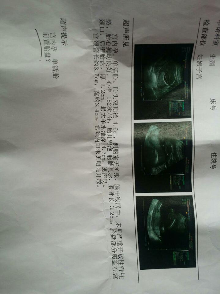 今天19周照B超说前置胎盘,大夫说不让走动了,容易大出血孩子大人都保不住,心情很紧张