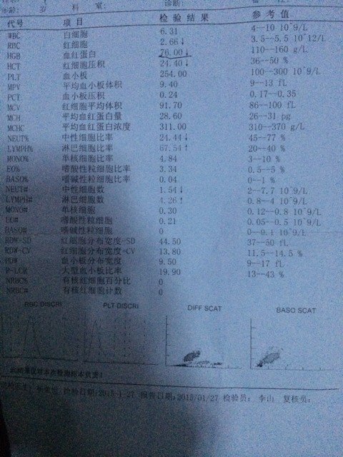 求懂得人给看看宝宝的化验单这样正常吗、血常规的、医生说有点贫血、宝宝现在50天、要怎么办 点击展开 56...3@qq.com_bb5q 2015-01-27 17:10 为您推荐: 其他回答 是的,贫血还蛮厉害的,需要检查清楚是何种类型的贫血,然后采用针对性的治疗,可能需要查下骨髓血。 戴陈诚 2015-01-27 19:46 相关问题 哪位医生给看看这是我家宝宝下午刚做的血常规化验单 宝宝今天半岁做了血常规,医生说贫血给开了维生素c 泡腾片,但是宝宝吃完就拉肚子了,两个小时拉了两次 测微量元素多少钱啊 是在打预防针这里测,还是去医院测 六个月体检,医生只做血常规,没贫血没要求测