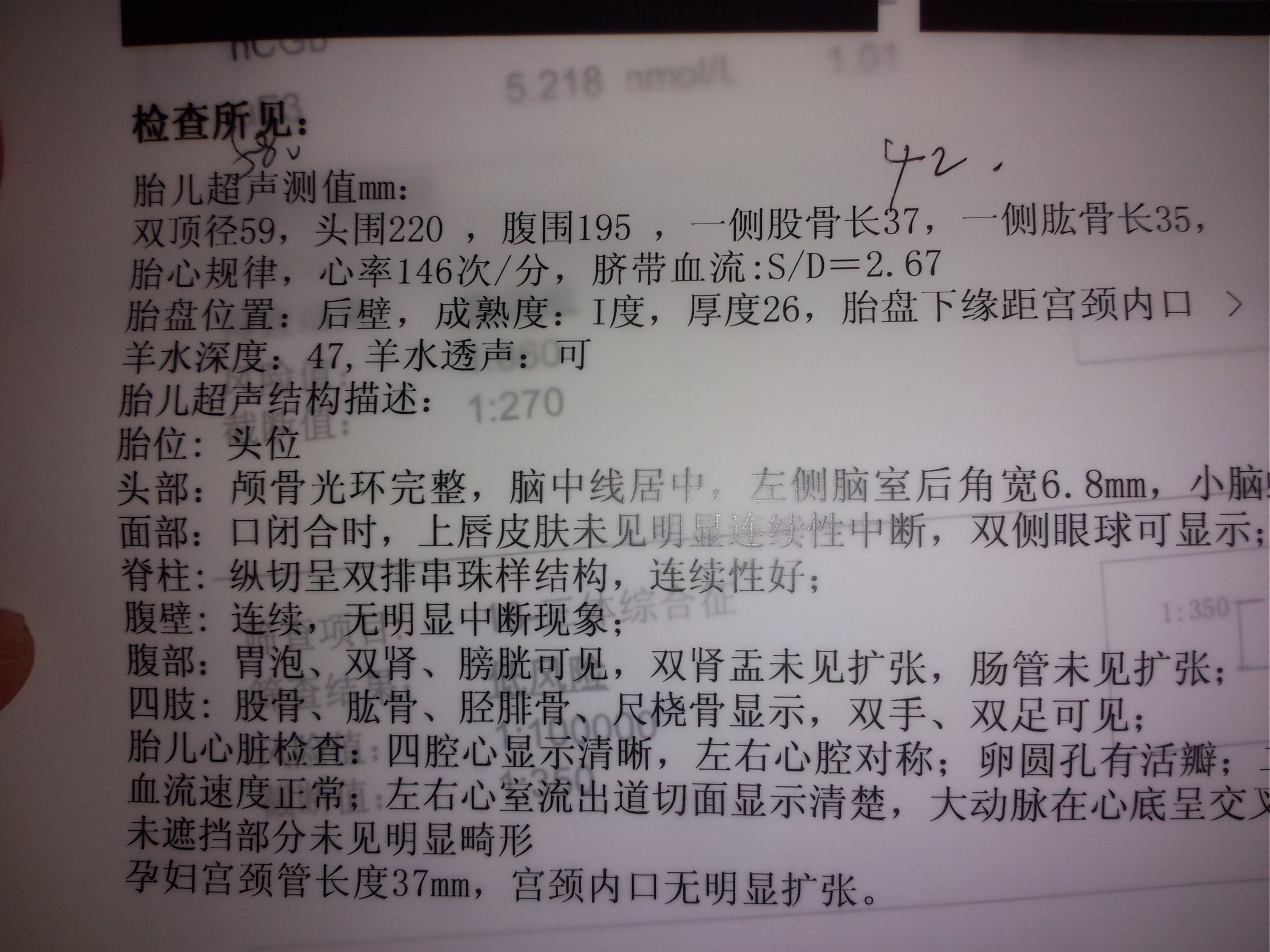怀孕23周去医院做四维彩超医生说宝宝胳膊腿短,有哪位懂得朋友帮我看看这数据正常吗,多谢了 点击展开 匿名用户 2014-12-31 16:17 为您推荐: 其他回答 多补充营养,做好定期检查 匿名用户 2015-01-15 09:22 建议定期复查 范姜嘉佑_7jkS 2015-01-02 07:53 宝宝个子不高 濯清逸_xybc 2014-12-31 16:19 相关问题 孕30周查四维彩超胳膊短4周腿短2周现在孕30周 之前没做 怀孕33周 股骨长径58mm 医生说会比正常人腿短点 这个严重吗? 今天去医院检查B超,宝宝双顶径93mm,股骨长68mm,羊水深度46mm,医生说宝宝腿短,怎么办?