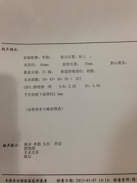 帮忙看看B超单,有没有什么问题,帮忙算下宝宝有多重了,谢谢! 帮忙看看B超单,有没有什么问题,帮忙算下宝宝有多重了,谢谢! 点击展开 最毒妇人心丶 2015-01-07 16:09 为您推荐: 其他回答 祝宝宝健康 不一样的自己 2015-01-07 20:24 你好,根据公式计算,双顶径9.5*900-5200就是估计的胎儿体重的3350克,你的羊水就超正常范围一点,可以观察看 天使7737 2015-01-07 18:11 不会看啊… 典凡妈咪 2015-01-07 16:48 快7斤了。。 156*****702_jdMH 2015-01-07 16:18 正常的啊啊 女人不狠地位不稳_BJJo 2015-01-07 16:12 加载更多 相关问题 请帮忙看看宝宝情况好吗 有多重了 怀孕32周 孕妈体重125算瘦还是胖 那宝宝会有多重 我想问一下 我的宝宝是不是很小啊 你们能给看大约到生的时候能有多重