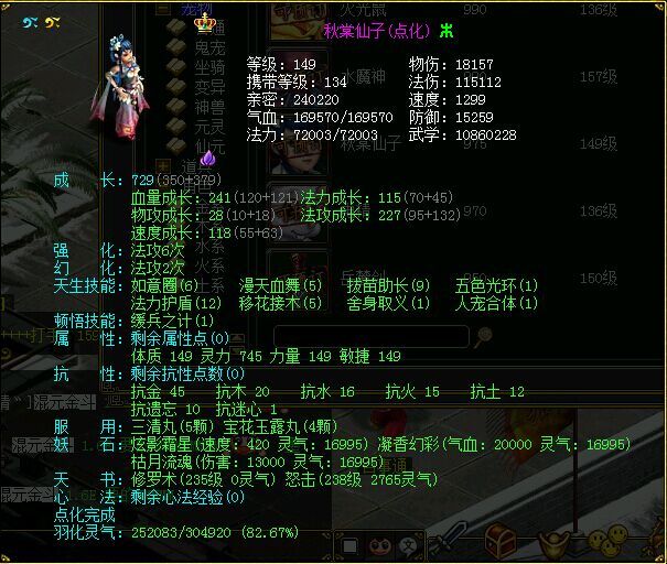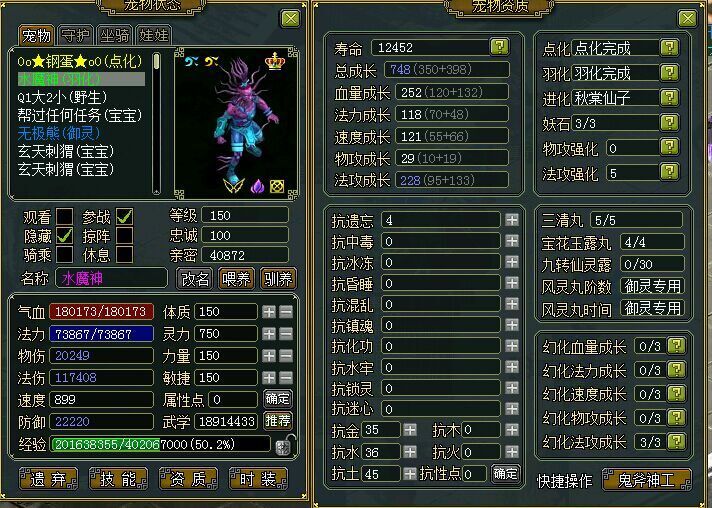 下面这个水魔神是我自己做的,问一下现在法攻成长还能通过什么渠道来增加吗,为什么上面那个秋棠仙子就比我多强一,而且羽化还没完成,幻化还比我少一次,成长就跟我的水魔神差不多了,现在问道是不是普通宝宝最多强5而且法攻最多228?我看排行榜上有个小鸟法攻二百五十多