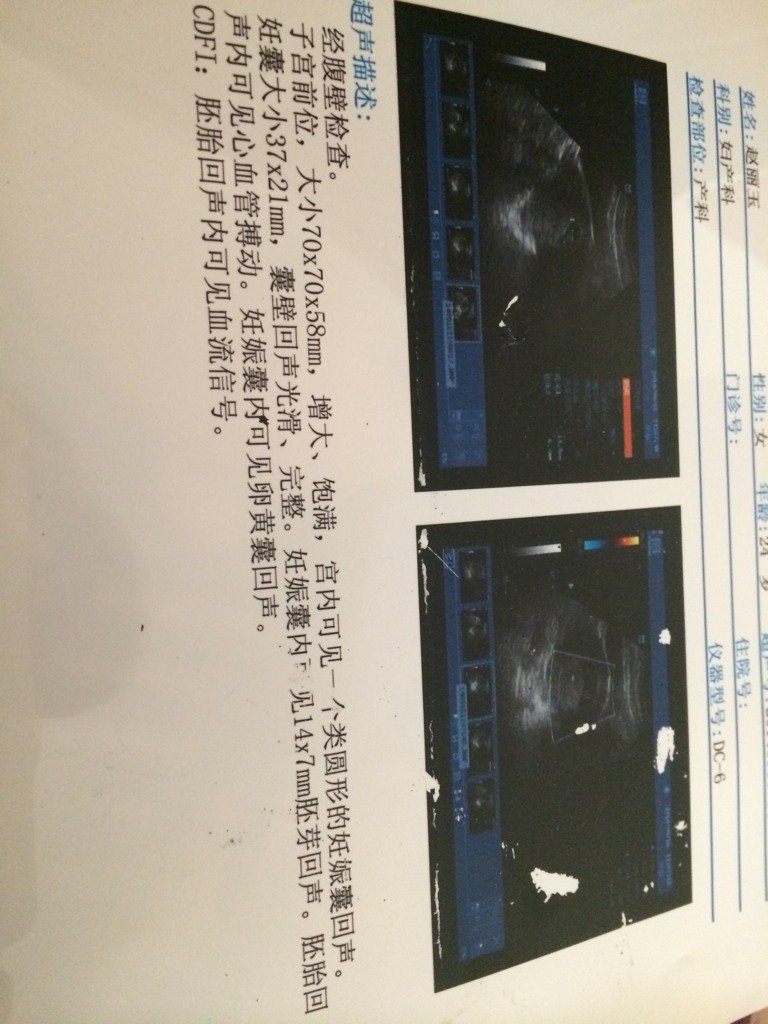 从此次b超检查结果看,是正常的宫内早孕,已有胎芽和原始心管搏动,估计孕周在7周左右。建议注意孕期保健,定期检查。