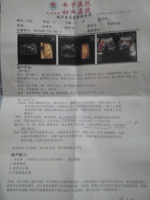 四维彩超的检查结果来看,考虑是怀孕25周零四天,脐带饶颈,别的不是很要紧,要注意细心观察,如果胎动频繁或者明显减少,要警惕胎儿宫内窘迫的可能,要及时就医复查,要注意合理营养,平衡膳食,注意多休息,保证充足的睡眠时间。