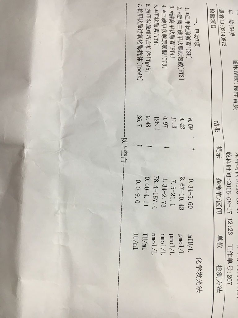 做了甲状腺乳头状癌切除手术后,半年后抽血检查以下报告,帮忙看下情况严重吗?谢谢 点击展开 母婴用户106198783 2016-08-22 15:43 满意回答 目前促甲状腺激素升高,存在甲状辉叹腺功能减退,需要口服优甲乐治疗,如果已经口乔概服府慕近,需要调整剂量。 ů֪7782 2016-08-22 15:47 宝宝知道提示您:回答为网友贡献,仅供参考。 相关问题 乳头状甲状腺癌手术已经无法完全切除,只切除了甲状腺,之后应该如何治疗? 我去年做过两次甲状腺乳头状癌手术,甲状腺全切,一直服用优甲乐,想问一下能补充VC VE这类的维生素吗? 甲状腺乳头癌手术后两个月饮食应该注意些哪些?海带、紫菜这些食物能吃吗?希望不要从网上复制过来 谢谢