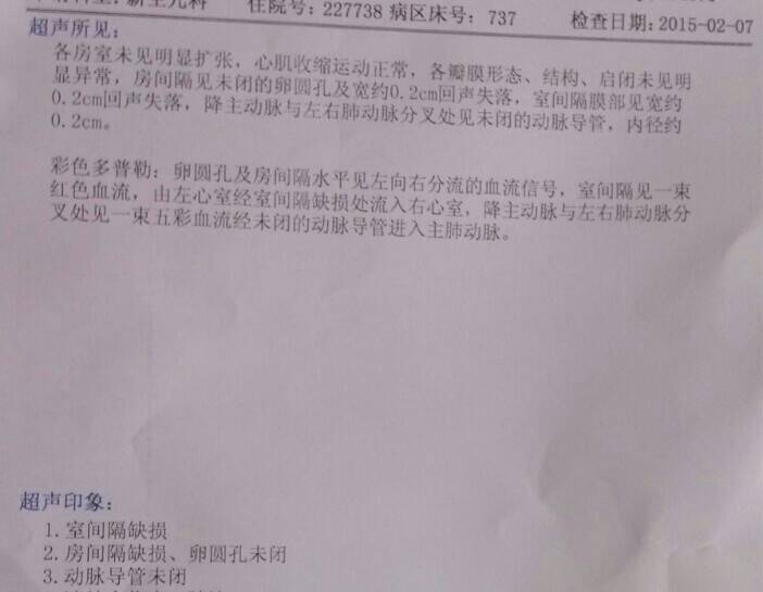 女儿出生三天,心脏彩超见下图 这种情况可以自愈吗?求婴幼儿专业人士给以回答 跪谢!! 点击展开 匿名用户 2015-02-22 20:58 为您推荐: 其他回答 你好,这种情况属于复杂型的先天性心脏畸形,自愈的可能性几乎没有,建议定期复查,积极联系能够完成心脏手术的大型医院,为手术做准备。 无诛斋主 2015-02-22 22:15 相关问题 有心脏科的专家吗?我家宝宝三个月了,刚出生查出有先天性心脏病,下面是彩超单子 请问严重吗,有自愈的 我们家宝宝今天11天,女,心脏彩超查出先天性心脏病,请问可以治好吗?自愈的可能性大吗?下面的图片是 医生,您好!我的宝宝一个月时心脏彩超显示卵圆孔未闭和房间隔缺损,能自愈吗?