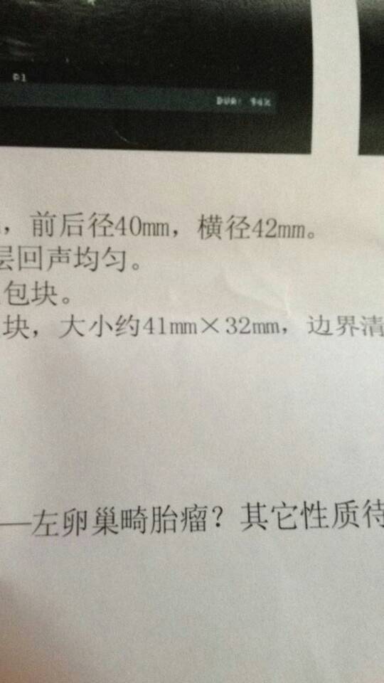 检查原因:月经不调 检查结果:左卵巢阴影41*32mm(畸胎瘤???) 问,想怀孩子,老是怀不上