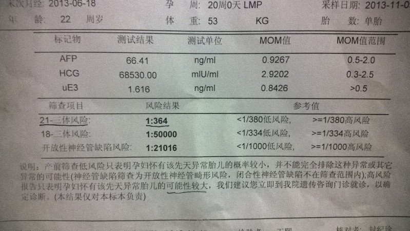 产前筛查报告单,请帮我看下这个有风险么,谢谢!!在线等 点击展开 匿名用户 2013-11-14 20:27 为您推荐: 其他回答 病情分析: 你好;这情况建议你可以到当地临床医生的指导下咨询的. 指导意见: 具体诊疗请一定到医院在医生指导下进行,祝健康。 六飞烟_TKY4 2013-11-14 20:40 相关问题 产前筛查报告单说是中风险 产前筛查报告单,我想知道里面的结果有风险