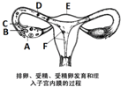 由女性生殖系统及排卵、受精和怀孕示意图可知:A表示卵巢,B表示卵细胞,C是输卵金趋管,D是受精卵,E是子宫,F是胚泡. (1)A卵巢:女性主要的性器官,产生卵细胞和分泌雌性激素. (2)胎儿生活在子宫内半透明的羊水中,通过胎盘、脐带从母体获得所需要的营养物质和氧气,胎儿产生的二氧化碳等废物,也是通过胎盘经母体排出体外的. (3)试管婴儿是指用人工的方法使精子与卵细胞在体外的试管中结合形成受眨眠精卵并进行早期胚胎发育,然后把胚胎移植进母体的子宫内,胚胎和胎儿的发育在子宫中进行,直至发育成熟,分娩产出.可见,“试管婴儿”的生命始于一个细胞--受精卵,其胚胎发育的主要场所是子宫,试管只是初期发育的场所. (4)青春期男孩女孩面临第一次遗精或月经初潮时,恰当的做法是、青春期少年也要协作互助,共同进步,建立真诚的同学友谊,要主动与老师裁狼怪和家长交流,求得指导和帮助;焦虑不安、苦闷,不让人知道,会造成心理压抑,不利于身体健康;要养成良好的卫生习惯,注意经期卫生,健康生活,因此没心情学习了,想玩,也是不对的.故答案为:(1)A卵巢;卵细胞;分泌雌性激素(2)羊水(3)受精卵;E子宫(4)BD