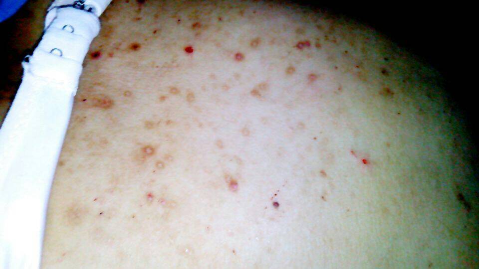 有医生吗?麻烦看一下,这是皮肤病吗?一抓就成这样了,我朋友整个后背都是,好恶心 有医生吗?麻烦看一下,这是皮肤病吗?一抓就成这样了,我朋友整个后背都是,好恶心 点击展开 半夏微凉、不成殇° 2014-06-23 00:33 为您推荐: 其他回答 这个还是座疮引起的症状,还是比较严重的。需要积极服用药物皮肤病血毒丸和葡萄糖酸锌口服溶液。局部使用阿达帕林凝胶。 申兰阔 2014-06-23 07:11 我怀孕的时候也是这样子 群主你楠楠姐 2014-06-23 03:11 怎么了!? 187*****115_HWqE 2014-06-23 00:36 相关问题 五个月宝宝后背有几处有点干抱皮是皮肤病吗 后背有点疼麻烦,医生支支招