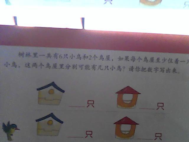 幼儿园树林里一共有6只小鸟和2个鸟屋,如果每个鸟屋至少住着一只小鸟,这两个鸟屋里分别可能有几只小鸟 ?请你把数字写出来。 点击展开 匿名用户 2014-01-07 17:26 为您推荐: 其他回答 1 5 2 4 3 3 4 2 5 1 匿名用户 2014-01-07 17:34 相关问题 家里掉了一只小鸟好奇是什么鸟 孕妇梦见一个鸟蛋破了飞出一只小鸟 我 是孕妇,昨晚梦见抓到了一只小鸟,不知道是什么鸟,很想知道是生男孩还是女孩