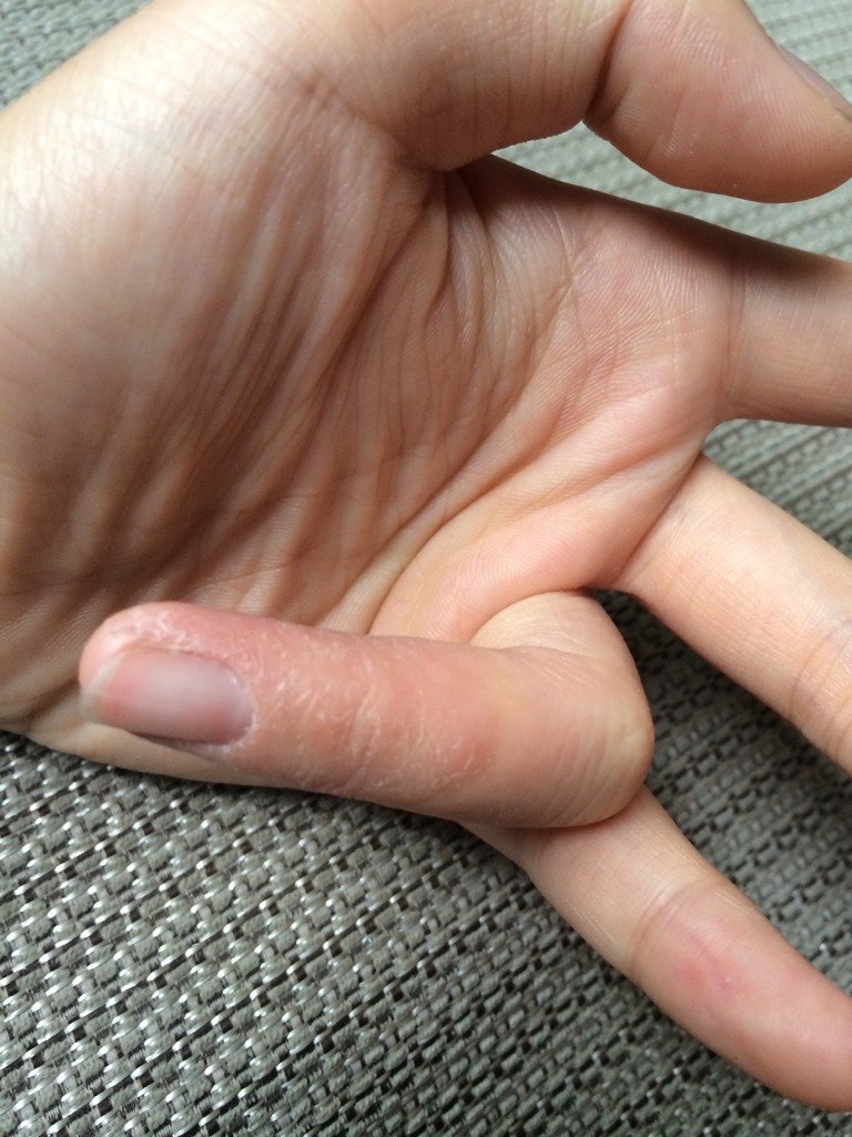 怀孕前手上有些脱皮,那时候没去重视,现在脱皮越来越严重,本来是左手指,现在右手指都有了,而且无名指