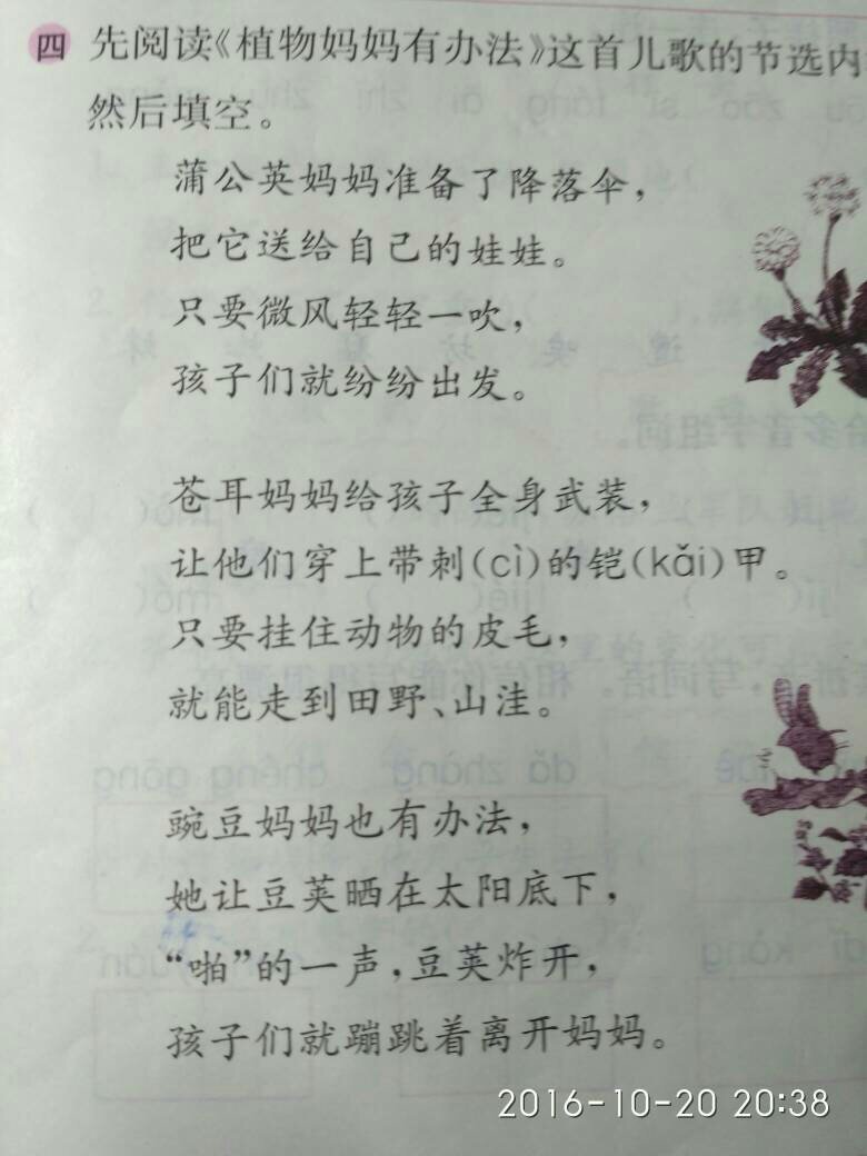 阅读《植物妈妈有办法》儿歌回答其他植物的种子出发方法 阅读《植物妈妈有办法》儿歌回答其他植物的种子出发方法不能写写过的,大豆跟豌豆同一类的也不能写。写了不采纳 点击展开 匿名用户 2016-10-20 20:42 满意回答 椰子妈妈把孩子送进大海,让它们随着海浪旅行 系欣可_g3Pt 2016-10-20 20:44 宝宝知道提示您:回答为网友贡献,仅供参考。 相关问题 植物妈妈传播种子有办法仿写儿歌 冬天里不怕冷的植物写一首儿歌 绿色植物儿歌幼儿园
