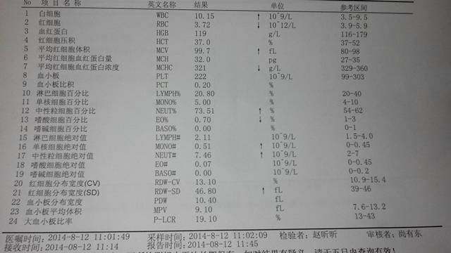 请医生给我看看这张单子有没有问题,谢谢! 请医生给我看看这张单子有没有问题,谢谢! 点击展开 开心小甜甜 2014-08-12 18:43 为您推荐: 其他回答 白细胞有点高、中性粒百分比高点,提示细菌感染但不严重。血红蛋白正常值下限,合理饮食加强营养。 太阳的温存 2014-08-13 11:44 有问题,给医生看一下吧 逝着。忘了你 2014-08-13 09:33 贫血吧 妈妈的爱欣 2014-08-12 20:52 相关问题 请问医生这张单子是什么问题? 有没有医生帮我看看昨天检查的单子,宝宝入盆了,大概什么时候会生啊 请问一下医生,可以根据这个单子帮我看看有几个月了,预产期是多久?谢谢