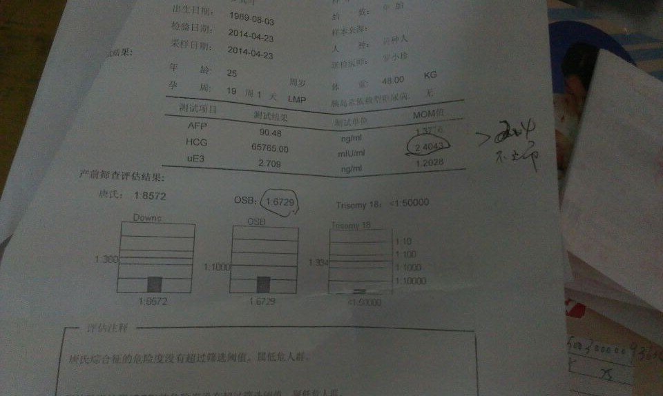 请医生帮我看下我的唐氏筛查结果,去医院看的时候,这边的医生说HCG的MOM值有些高,不知这会不会影