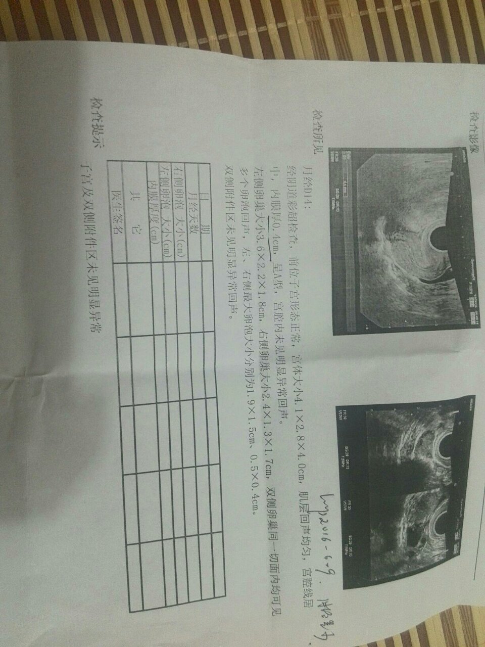 求医生给看一下,月经第14天,内膜厚0.4cm是不是太薄了不容易怀孕呀?卵泡1.9*1.5算优势卵 求医生给看一下,月经第14天,内膜厚0.4cm是不是太薄了不容易怀孕呀?卵泡1.9*1.5算优势卵泡吗 点击展开 WWW霸道小女人 2016-06-24 11:15 为您推荐: 其他回答 祝您健康平安幸福,亲赏点金币呗!谢谢你 豪豪妈妈的小情人 2016-06-24 11:34 相关问题 7月23月经来了,28号干净,去医院打了六天促卵针 现在内膜1 1cm右边卵泡2 3×2 1c 我结婚一年都没怀孕,去医院检查说我是多卵卵巢,医生用药水帮我把卵泡催成熟才怀上的 那这样糖尿病筛查 上次月经11 29日,周期30天,16日检测出来有优势卵泡,17日晚上内射了 会怀孕码??求解