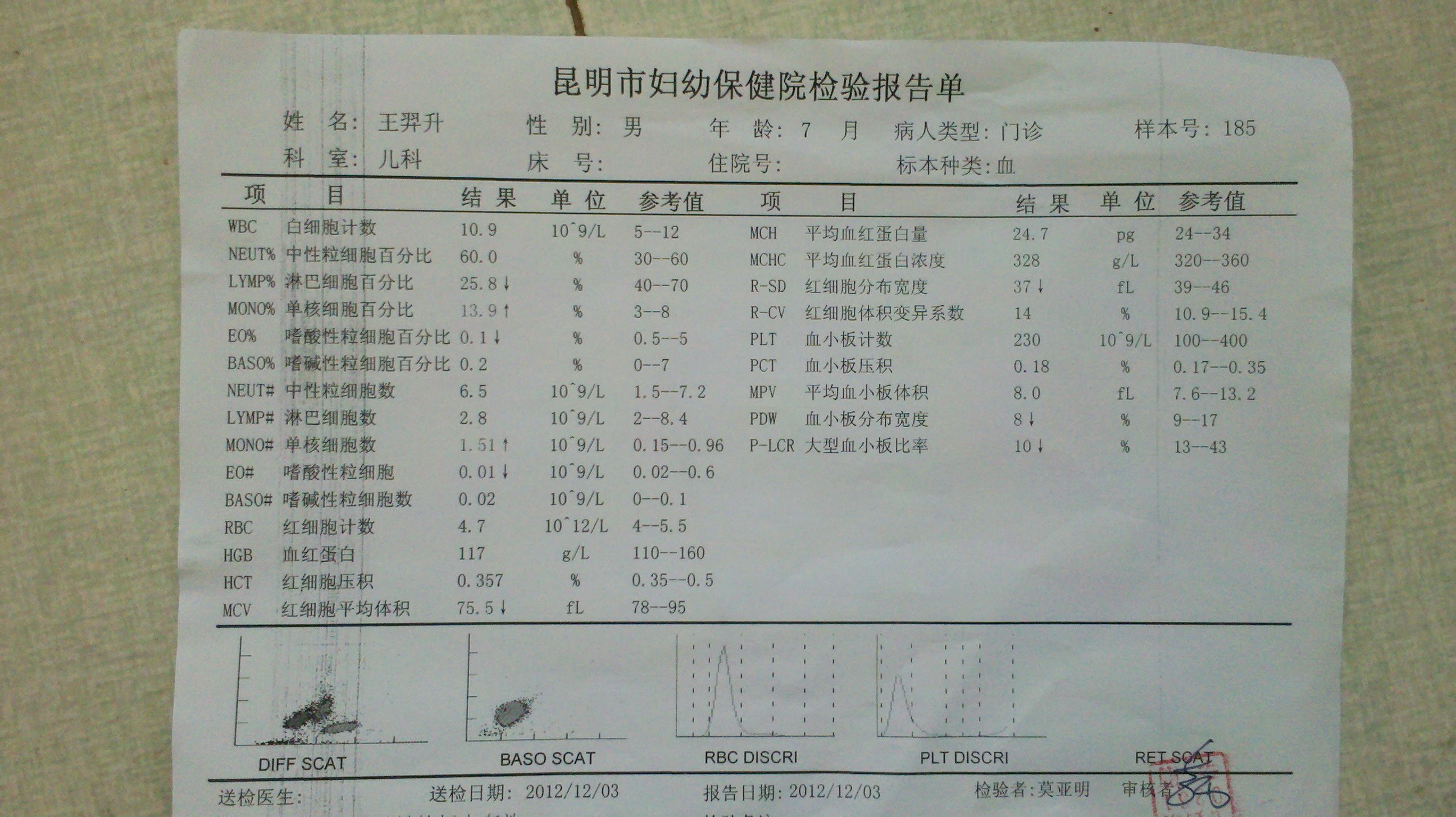 8个月宝宝发高烧到39.6度,口服泰诺林、洗温水澡后体温下降到38以内,但是连续两天反复发高烧到39度以上 请问医生这怎么处理,另附抽血检验报告一份。谢谢! 点击展开 匿名用户 2012-12-04 09:32 为您推荐: 其他回答 看报告单没有什么问题,白细胞不高证明没有炎证,是不是小孩长牙齿?最好是贴一下兵兵贴。小孩的精神状态怎样? 匿名用户 2012-12-04 09:49 相关问题 小孩体温39 5度,是发高烧吗? 我家宝宝发高烧在38-39 6度怎样退烧 我家宝宝发高烧在38-39 6度怎样退烧