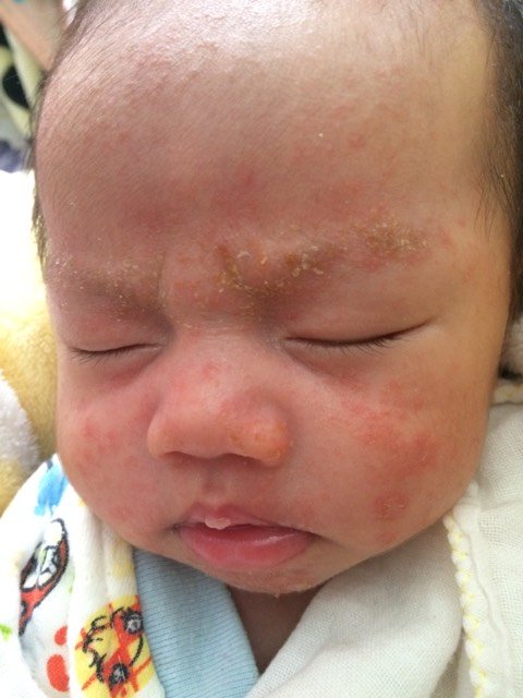 可能是湿疹。大部分宝宝都有湿疹,如果宝宝不痒可以不管,痒的话抹点紫草膏,但湿疹一般不去根,等宝宝1岁左右自然就好了。宝妈注意忌口,能诱发湿疹的东西坚决不吃。祝宝宝健康快乐成长!