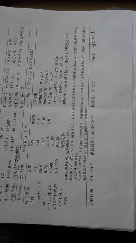 请帮我看一下唐氐筛查报告单是否正常 请帮我看一下唐氐筛查报告单是否正常 点击展开 幸福在身边_O5UP 2014-10-29 14:37 为您推荐: 其他回答 你好,你有两项检查是高风险的,如果你的检查结果是这样子的话,那是不能排除胎儿异常的可能性的,你还是考虑做个羊水穿刺或者无创DNA比较好 一直在路上yw 2014-10-30 17:52 低风险就是没有事,高风险需要做进一步检查 阿拉蕾蕾 2014-10-29 14:47 低风险,没事的 137*****650_rkn0 2014-10-29 14:46 好着呢祝好孕哦 准妈豆豆 2014-10-29 14:46 都是低风险没事的 硪那麼小心ヽ還是丟了沵 2014-10-29 14:44 加载更多 相关问题 上次做的唐氏筛查报告单,帮忙看看正常吗! 请医生帮忙看一下唐氏筛查报告单是否正常 宝妈们帮我看看唐氏筛查报告单,是否宝宝健康???