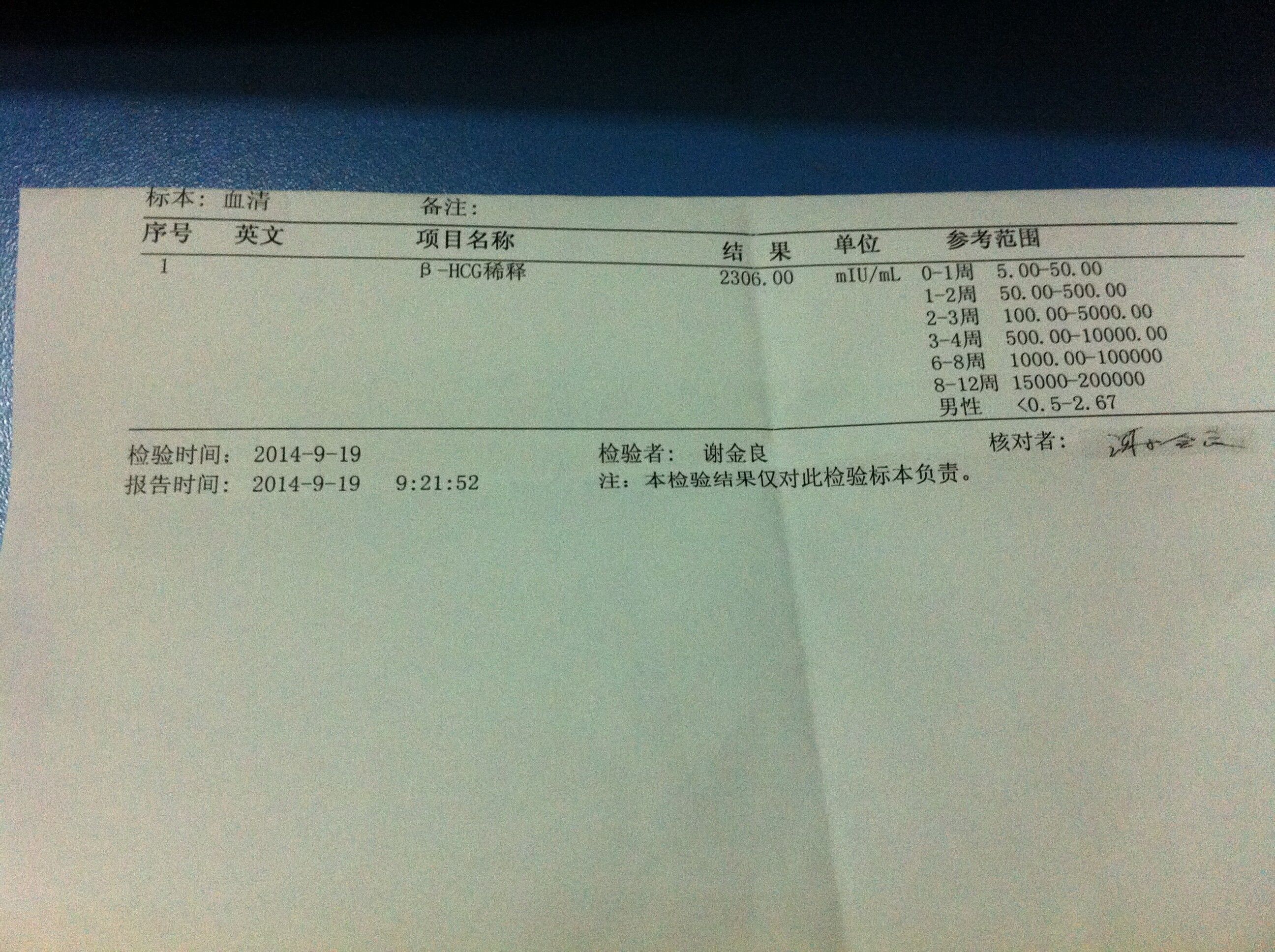 这张检验报告是什么意思?能看出是不是宫外孕吗? 点击展开 匿名用户 2014-09-19 15:43 为您推荐: 其他回答 可以检测是否怀孕。但并不是衡量是不是宫外孕。异位妊娠,但应该也不会在子宫里。 感到疼痛,如果要马上去医院,宫外孕的危险性很大 匿名用户 2014-09-19 15:47 相关问题 看不懂这个检验报告,大家帮我看看,是不是宫外孕 试管婴儿14能检查出宫内孕和宫外孕吗?单胎和双胎是不是必须要一个月才能检查出来 一张是6 5的,一张是6 7的,医生说估计是宫外孕,目前下面流血4天了,不多 就今天是红色的,上